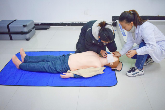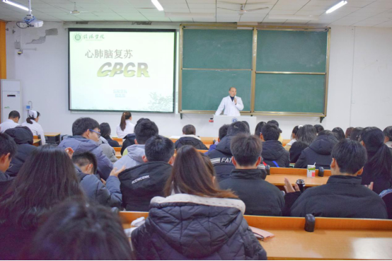 此次培训分为理论讲授和现场实践操作两部分。急救培训活动的主要内容包括危及生命情况的识别与急救反应系统的启动、成人心肺复苏技术的识别与急救,以帮助大家在第一时间内应对发生在学校、家庭或公共场所的突发状况,为挽救病人生命争取时间和机会。在理论讲授过程中,张光强医师用生动鲜活的实例与通俗易懂的语言向师生们详细讲解如何应对和处理一些日常生活中的突发情况,如何在有效的抢救时间内进行应急救护。在心肺复苏的现场实践练习环节,陈慧利用心肺复苏模拟人,给大家做了详细的心肺复苏急救操作的讲解和现场示范,并邀请师生们进行现场练习操作,对出现的错误给予及时纠正和指导,使师生们对心肺复苏的全过程有更加深刻的理解。