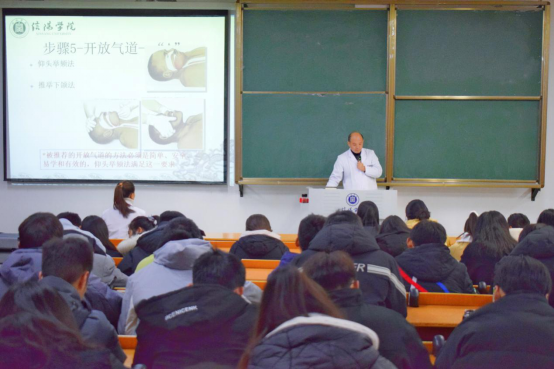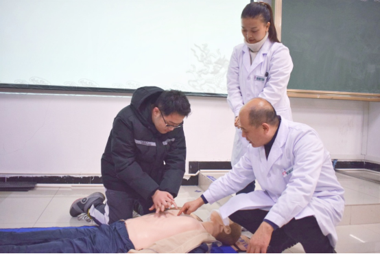 为进一步提高同学们应对突发事件的能力,普及自救、互救技能,加强生命安全教育,11月24日下午,太阳集团校医院张光强主治医师带领的团队在社科楼219教室进行心肺复苏急救知识操作培训,团队成员有张光强主治医师、刘志军副主任医师、陈慧影像技术、程明主管护师。参加此次培训的有刘雪老师和20级历史本科1班、3班以及20级法学本科2班全体成员。