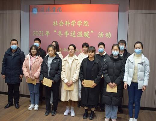 活动的最后,胡志国和薛姗姗为同学们发放寒冬慰问金并合影留念,希望同学们可以带着学院的暖意度过严冬。