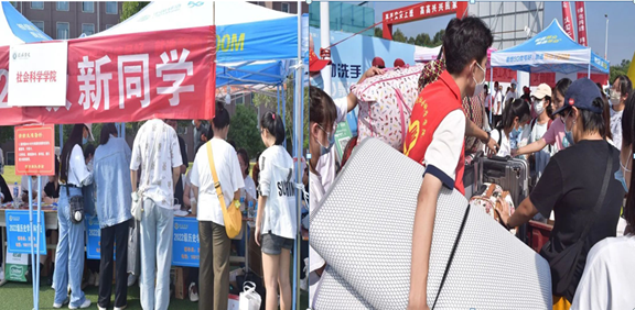 在火车站、汽车站设立的接待点,每一趟车一到站,新生和家长一抵达校门口,众多的迎新志愿者立刻微笑着迎上去:"你好","欢迎来到学校”,并"抢"下新生和家长手中沉重的行李。
