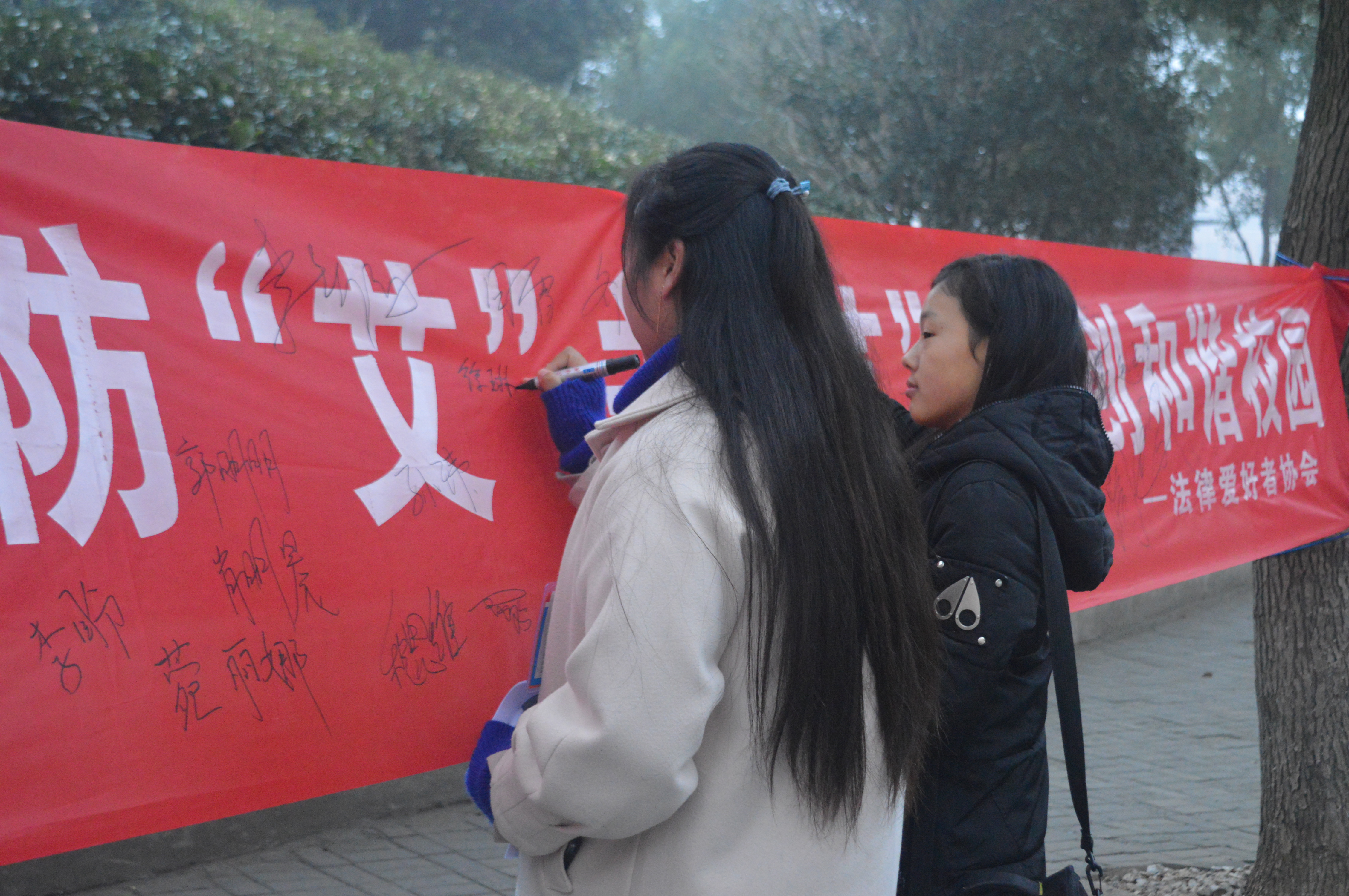 世界卫生组织于1988年1月将每年的12月1日定为世界艾滋病日,随着艾滋病在全球肆虐流行,现已成为重大的公共卫生安全和社会问题。 法律爱好者协会通过拉横幅,竖展板,向过往同学发宣传资料,讲解艾滋病的防范措施等方式引导他们正确认识艾滋病常识,提高他们的自我保护意识。到场的法协成员都在横幅上签名,为此次活动起了良好的带头作用。