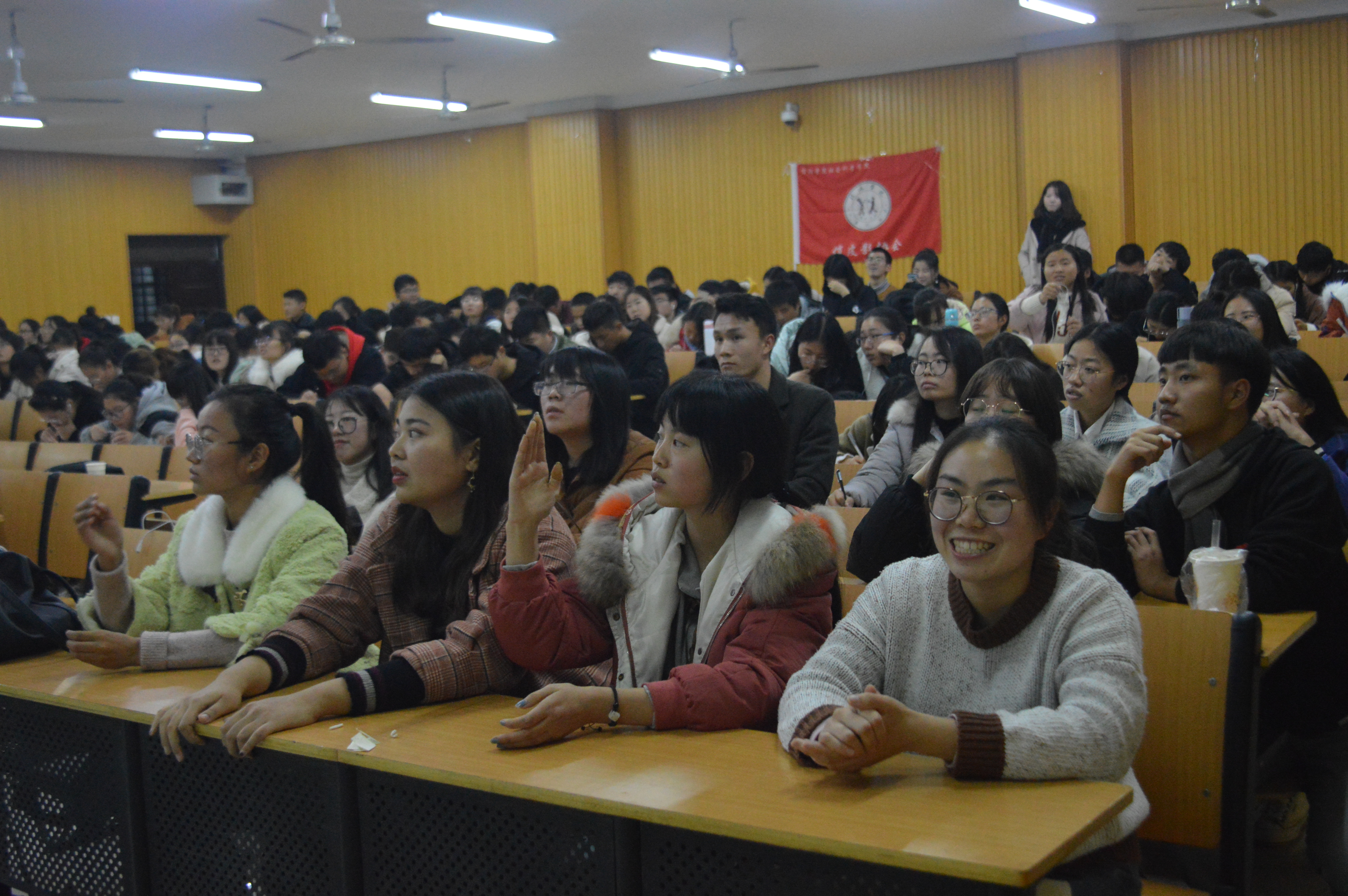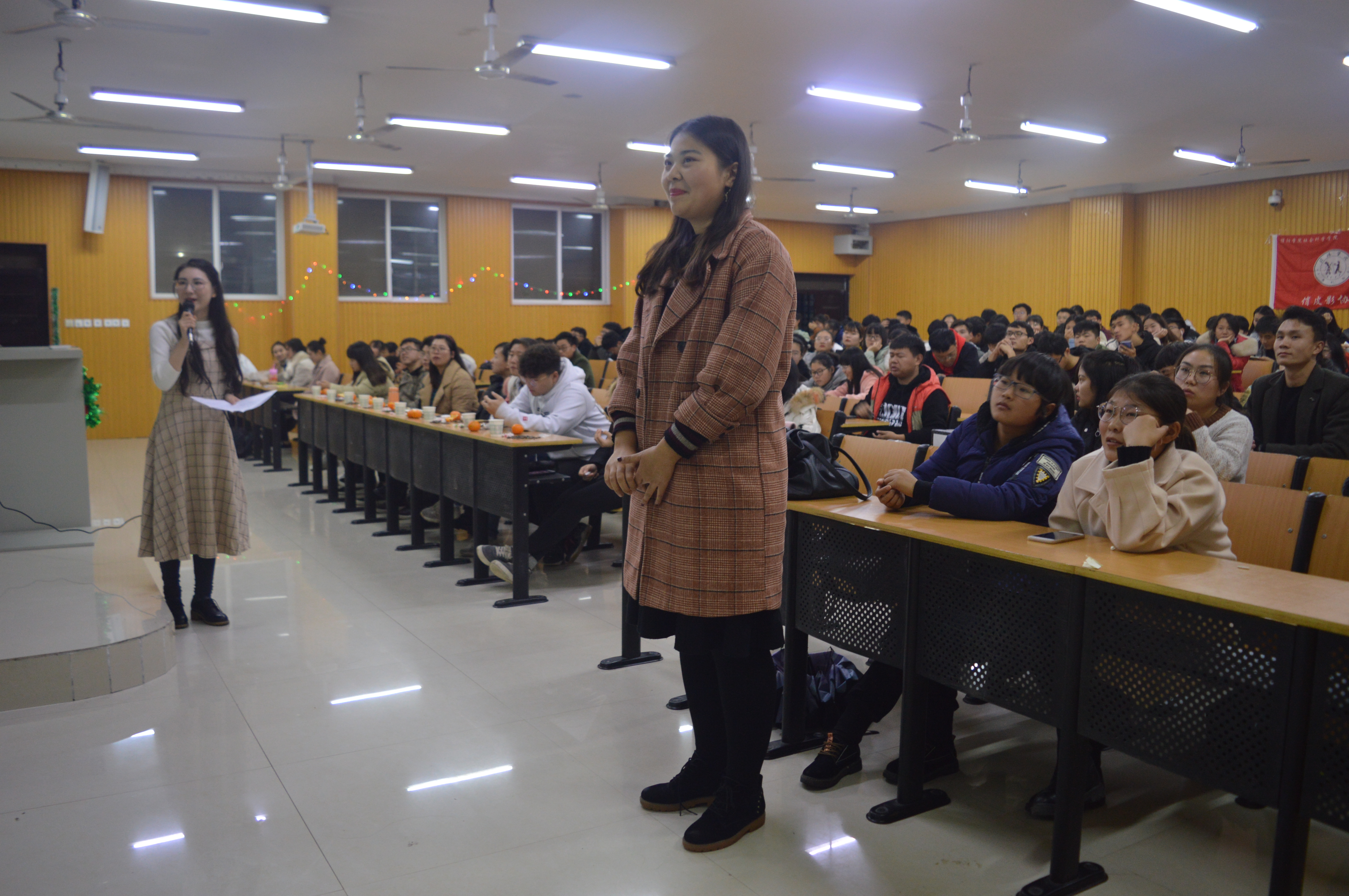 本次比赛分为两轮,第一轮是十进三制,选手们根据抽签顺序答题,最终三位答题正确率最高的同学进入第二轮。第二轮以抢答方式进行答题,比赛过程中,选手们积极抢答,比赛进入白热化阶段。比赛休息过程中,陈明浩同学为大家带来的单口相声获得了大家的热烈掌声。此外,在比赛期间还设立了“观众答题”环节,充分调动了现场观众的积极性,将比赛推向高潮。最终,2号选手徐慧容获得一等奖,9号选手李蒙蒙获得二等奖,3号选手丁奕丹获得三等奖。并由谭安妮老师、朱亚楠老师和周余瑞老师为三位选手颁奖,竞赛在热烈的掌声中落下帷幕。