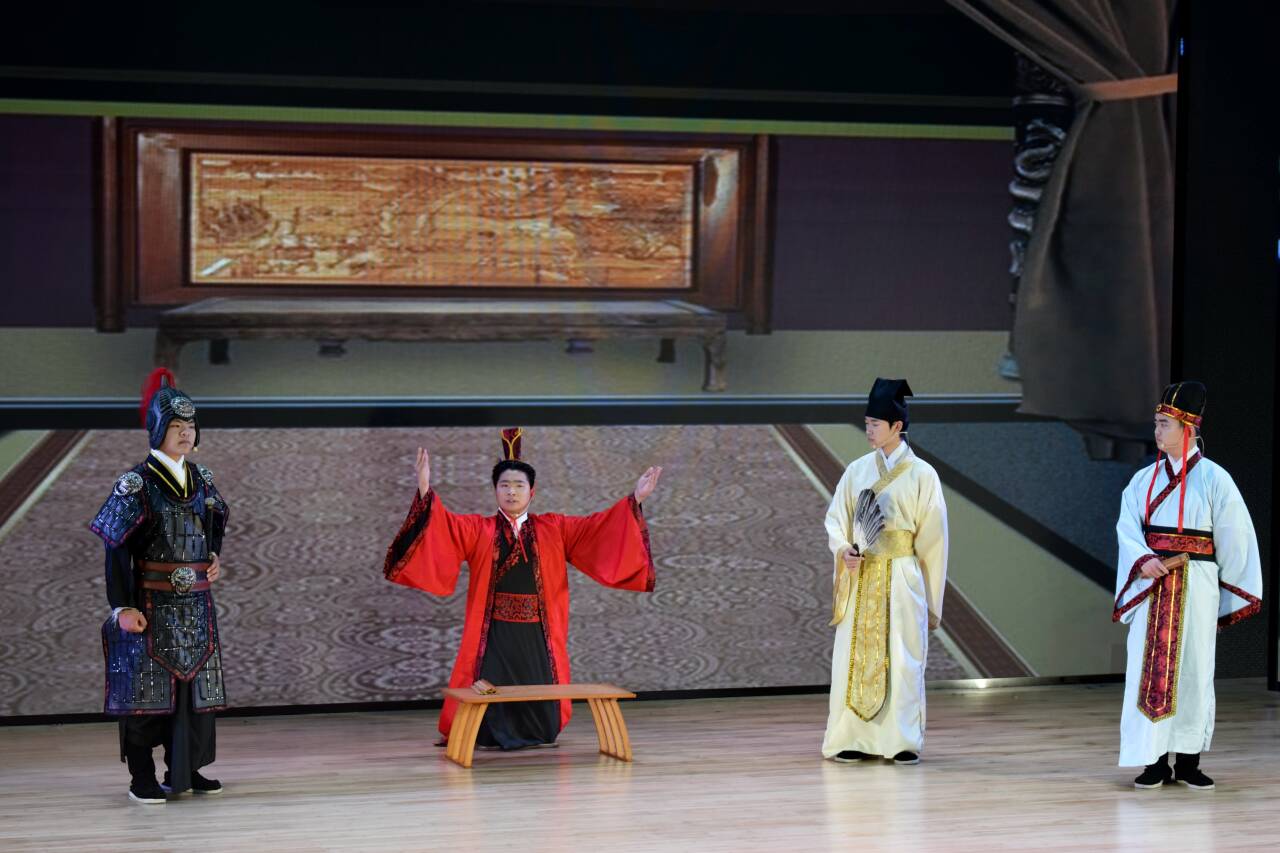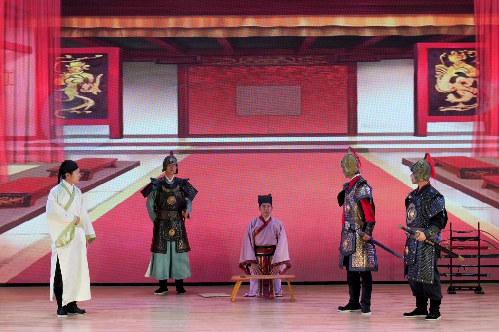在整场演出过程中,演员们演技精湛、台风端庄、细节处理得当。剧中饰演项羽的同学将其霸气、刚愎自用又重情重义的性格展现得淋漓尽致,从起兵时的壮志豪情到末路时的悲壮苍凉,情感层次丰富。虞姬的扮演者则将虞姬的温婉、坚韧与深情演绎得十分动人。刘邦、张良、樊哙、范增等角色也都各具特色,生动还原了历史人物的形象。舞台上,场景转换流畅,配合着精心设计的背景音乐和灯光效果,营造出了浓厚的历史氛围。从楚军帐中的商议到鸿门宴会的紧张,从垓下的凄凉到乌江畔的悲壮,每一个场景都让观众仿佛身临其境。