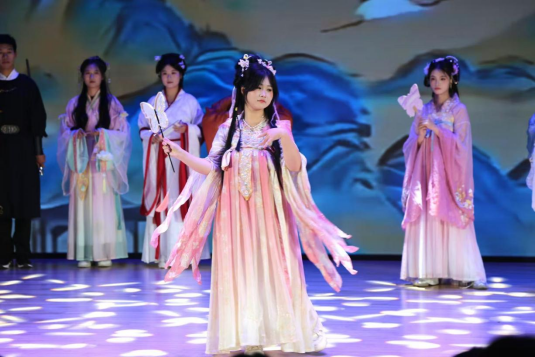 走秀《汉风大赏》无疑是晚会的一大亮点,模特们身着精美汉服,步履优雅,充分展示了汉服的华美与端庄,将汉服之美展现得淋漓尽致。随后,舞蹈《strategy》、古筝演奏《渔舟唱晚》、歌曲《天若有情》、舞蹈《舞蹈串烧》等节目依次登场,各具特色,为观众带来了一场视听盛宴。
