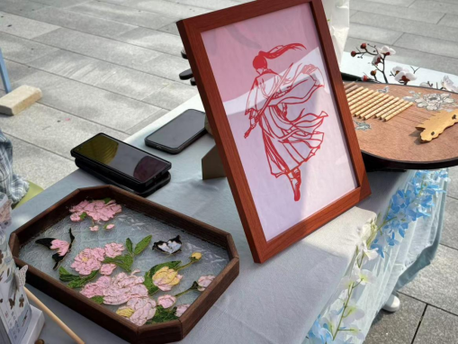 活动类型多种多样,通过传统手工艺体验,参与者可学习简单剪纸技巧并创作作品带走。在编制区放置串珠、花瓣、铜线等制作发簪的材料,由工艺组成员教授,制作的成品可带走留念。