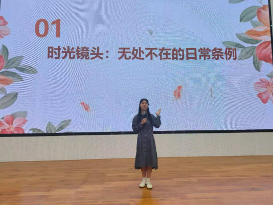 活动以“理论+案例” 结合的形式展开,内容丰富且贴近师生需求。首先,通过播放普法短片,直观呈现《条例》出台的背景与现实意义,快速吸引现场注意力;随后,借助PPT系统讲解《条例》的核心条款,包括社科普及的责任主体、内容范围、保障措施等,帮助师生建立对《条例》的整体认知框架。
