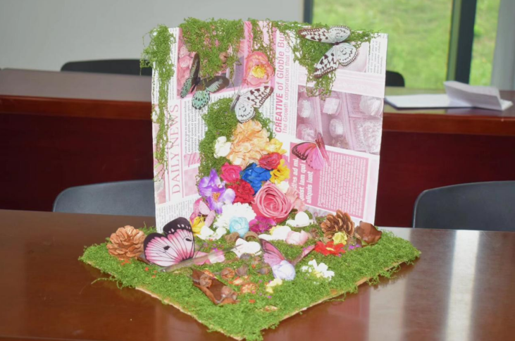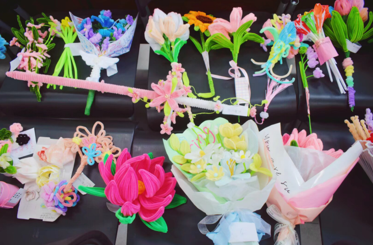 活动现场,同学们积极投入手工艺品创作,大家以扭扭棒、彩纸、丝带等材料为载体,精心制作出样式纷呈的花艺作品,在动手实践中感受手工艺术的独特魅力。