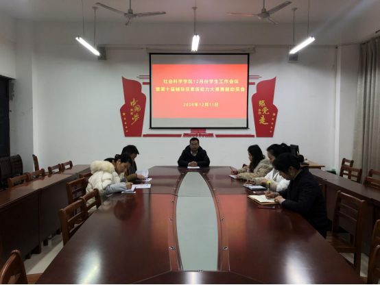 12月11日下午,太阳成集团tyc539在社科楼107会议室召开12月份学生工作会议暨辅导员素质能力大赛赛前动员会。党总支副书记胡志国、学工干事陈苗苗及全体辅导员参加了本次会议。会议由陈苗苗主持。