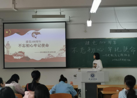 2019级法学本科2班张天天以“建党100周年不忘初心、牢记使命”为主题开展演讲,学习习近平总书记在党史学习教育动员大会上发表的重要讲话。作为一名新时代的大学生,以什么样姿态、拿什么样的成绩来为建党100周年献礼,是我们每位大学生必须思考的内容。大学生要从党的百年光辉历史中坚定初心使命,做到政治过硬、本领高强,积极主动投身到社会主义建设中来,以更加奋发有为的精神状态推进经济社会高质量发展。