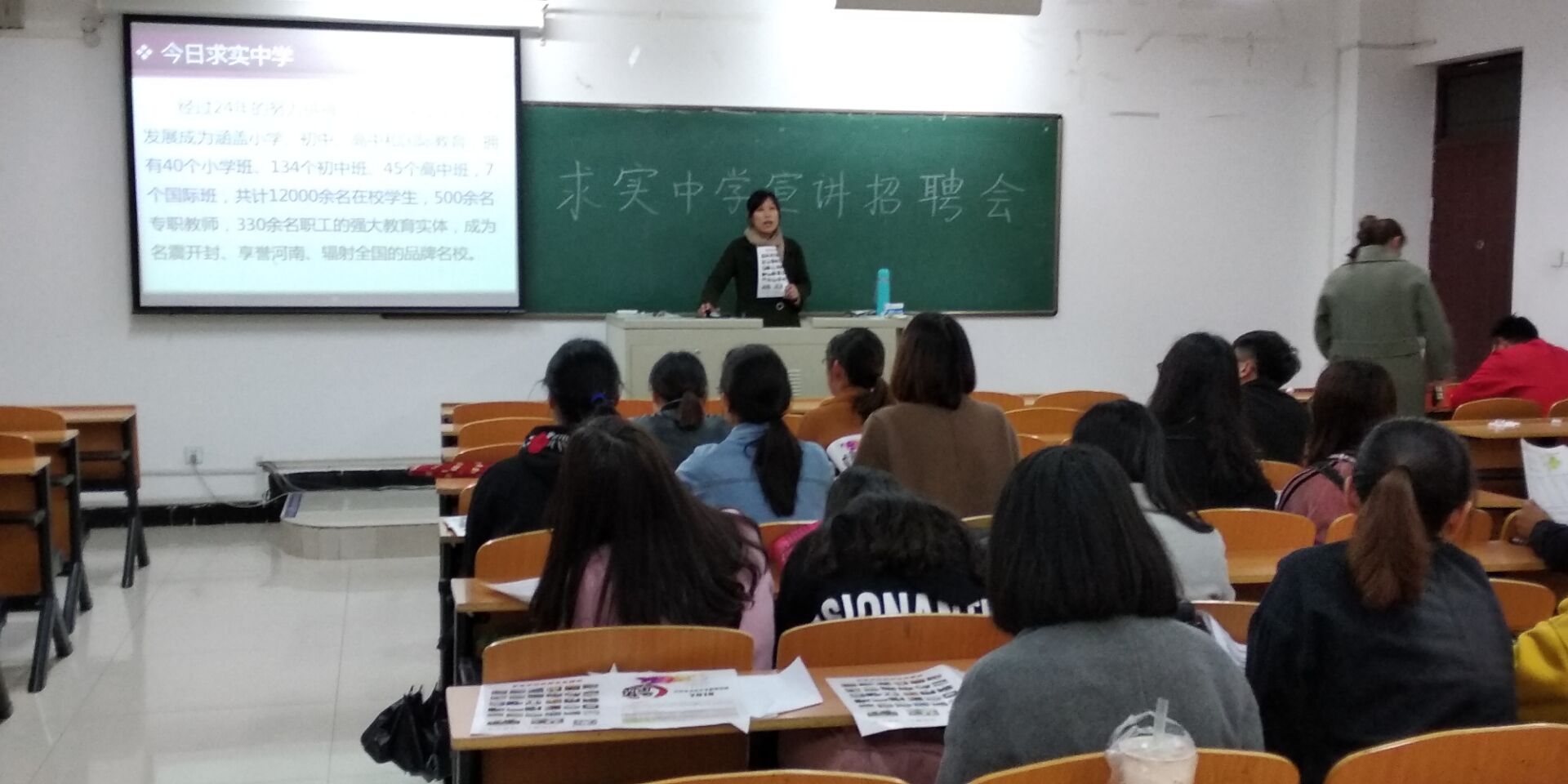 首先招聘老师通过ppt展示和视频播放的方式,对求实中学进行了详细的介绍。其中谈到求实中学教育理念与师资背景,介绍了求实中学的建筑与各种基础设施,以及最重要的招聘优势和工资待遇;其次求职同学对自己比较关切的晋升空间、薪资待遇、出外培训等问题向招聘老师进行提问,招聘老师一一进行耐心详实的解答;最后招聘老师收取同学们的求职简历和交代接下来进行的面试流程等。
