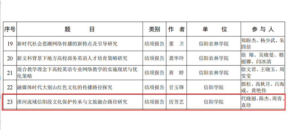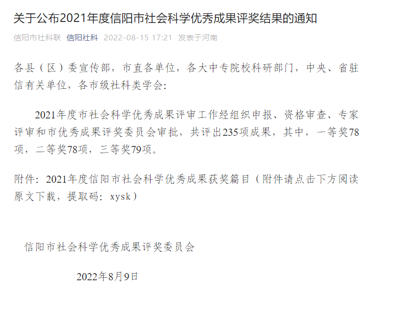 我院厉芳艺老师荣获2021年度信阳市优秀社会科学成果奖一等奖