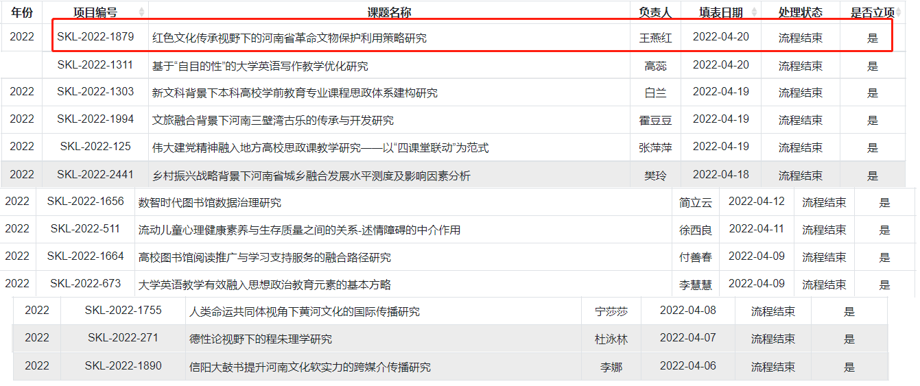 河南省2022年度社会科学调研课题评审工作已经结束。经个人申报、各单位组织推荐、科研处资格审查、专家评审和省社会科学领导小组批准,本年度我校共有13项课题获准立项。