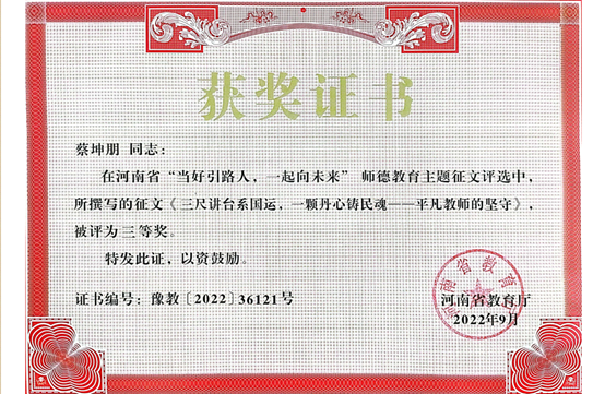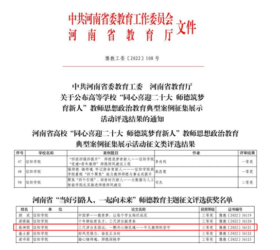 近日,河南省委教育工委、河南省教育厅发布《关于公布高等学校“同心喜迎二十大 师德筑梦育新人”教师思想政治教育典型案例征集展示活动评选结果的通知》(豫教工委〔2022〕108 号)和《关于公布“当好引路人,一起向未来”师德主题教育征文和师德师风优秀案例评选结果的通知》(教师〔2022〕304号),我校多名教师获奖。