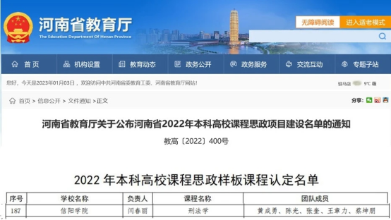 近日,河南省教育厅印发《关于公布河南省2022年本科高校课程思政项目建设名单的通知》(教高〔2022〕400号),我校太阳成集团tyc539闫春丽老师主持的《刑法学》课程获批为河南省2022年本科高校课程思政样板课程。这是我校课程思政建设工作取得的又一重要成果。