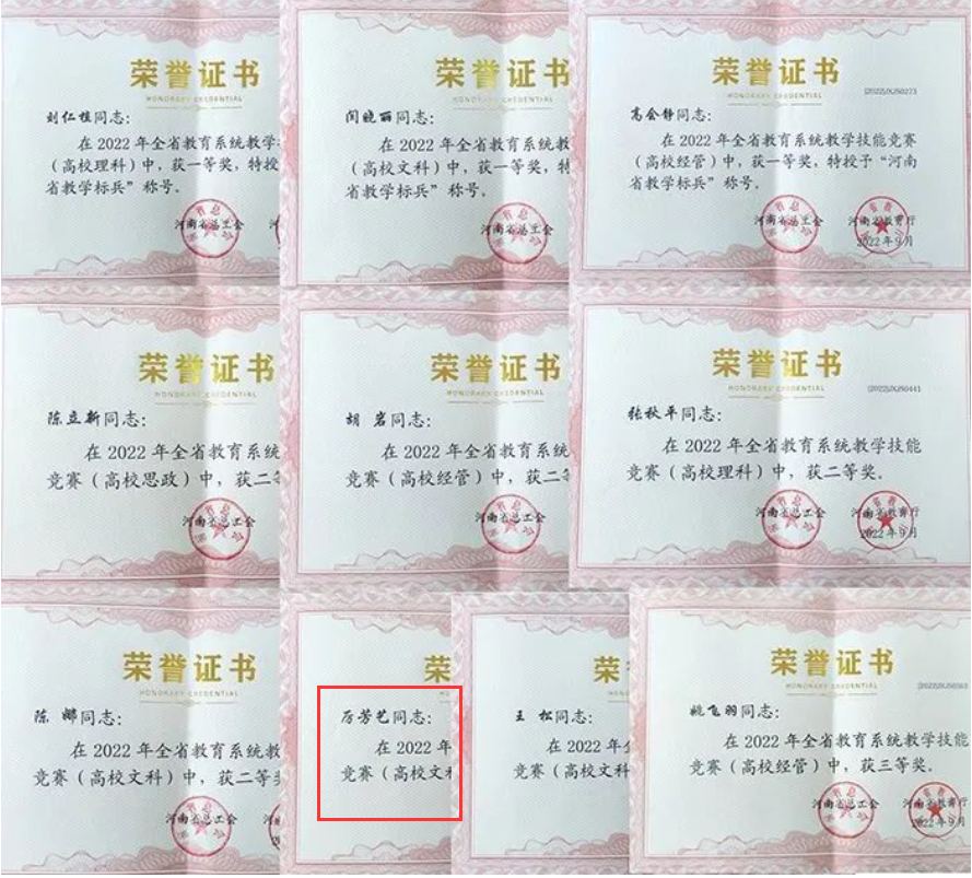 近日,由河南省总工会、河南省教育厅主办的全省教育系统2022年度教学技能竞赛活动落下帷幕。我校闫晓丽、刘仁植、高会静3名教师获一等奖,被授予“河南省教学标兵”荣誉称号;陈立新、张秋平、胡岩、陈娜4名教师获二等奖;姚飞羽、王松、厉芳艺3名教师获三等奖。