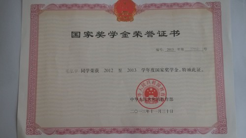 我系学生毛宏宇荣获国家奖学金