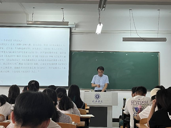 尹全海教授这次课程讲授的主题是《魏晋南北朝时期史学》。教学过程中,尹教授从魏晋南北朝的时代特点入手,这一阶段既有魏、蜀、吴三国并立,又有东、西晋前后相继,更有南朝、北朝南北对峙。如此政治局面在中国传统史学发展中留下深深络印。如《后汉书》《后汉纪》各美其美,延续了之前纪传编年二体角力之趋势;《三国志》《三国志注》及其兴起的史注之风,可谓史学多途发展的体现;陈寿《三国志》与习凿齿《汉晋春秋》纪传之争,《宋书》《南齐书》《魏书》三部正史,因当朝人修史而引发的正统之争,以及由此形成的正统史学观念是分治时期在史学上的最直接反映。中国第一部地方志书《华阳国志》的出现,则是中国史学的另一种新文类。尹教授从以上史籍入手,详细介绍了这一时期史学发展的脉络,逻辑清楚,对于重点部分着重强调,这些都值得我们青年教师学习,不仅要增加自身的知识储备,还要加强对课堂的驾驭程度。