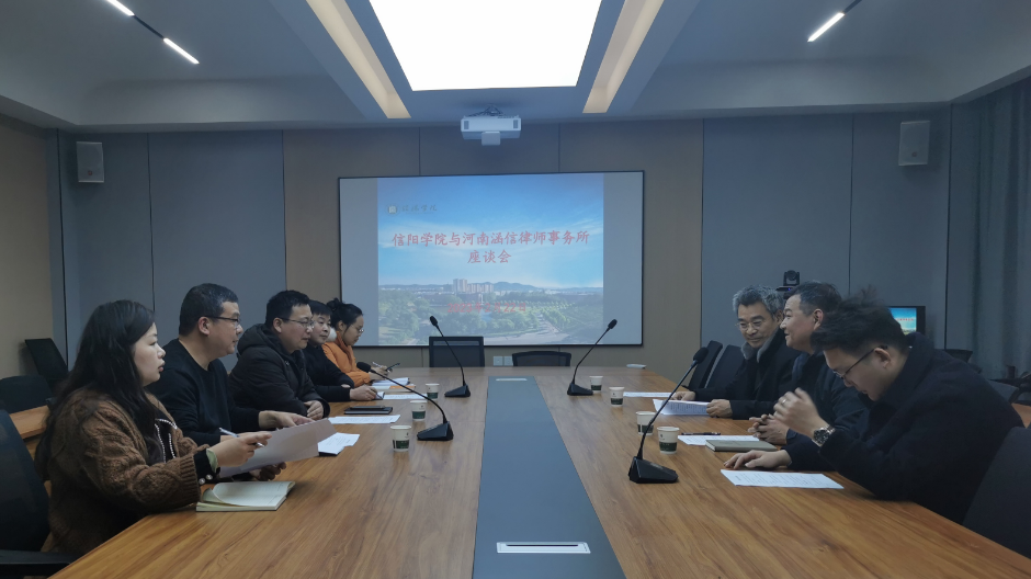 2月22日下午,太阳成集团tyc539与河南涵信律师事务所在社科楼419会议室举行合作交流座谈会。原信阳市委政法委二级调研员、市法学会副会长鲁玉明,河南涵信律师事务所主任董大磊;名誉院长、党总支副书记胡志国、教研室和学工负责人共同参加了此次活动。