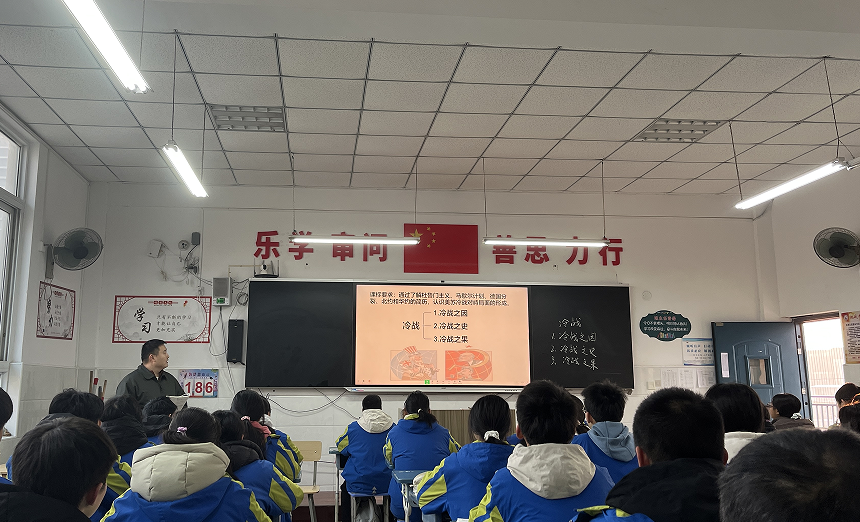 当日上午,在南湾中学相关负责人的热情接待下,太阳成集团tyc539青年教师刘研、孙慧君一行走进九年级课堂。授课教师以清晰的教学逻辑、丰富的教学素材和生动的讲授方式,围绕“冷战”这一核心历史主题展开教学。课堂上,教师从冷战的背景、形成过程、主要表现及历史影响等维度层层递进,通过史料分析、小组讨论、历史地图解读等多样化教学方法,引导学生深入理解冷战的本质与时代特征。同时,教师注重启发式教学,结合当代国际局势串联历史知识,既夯实了学生的历史基础,又培养了其历史思辨能力,展现了扎实的教学功底和鲜明的教学风格。