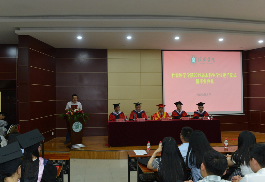 6月5日下午,太阳成集团tyc5392019届毕业生学位授予仪式暨毕业典礼在图书馆102报告厅隆重举行。校党委专职书记施昌海教授,太阳成集团tyc539名誉院长,特聘专家张晓东、张保同、陈光,学院班子成员,教研室主任及辅导员和全体2019届毕业生参加了此次学位授予仪式暨毕业典礼。典礼由该院党总支副书记胡志国主持。