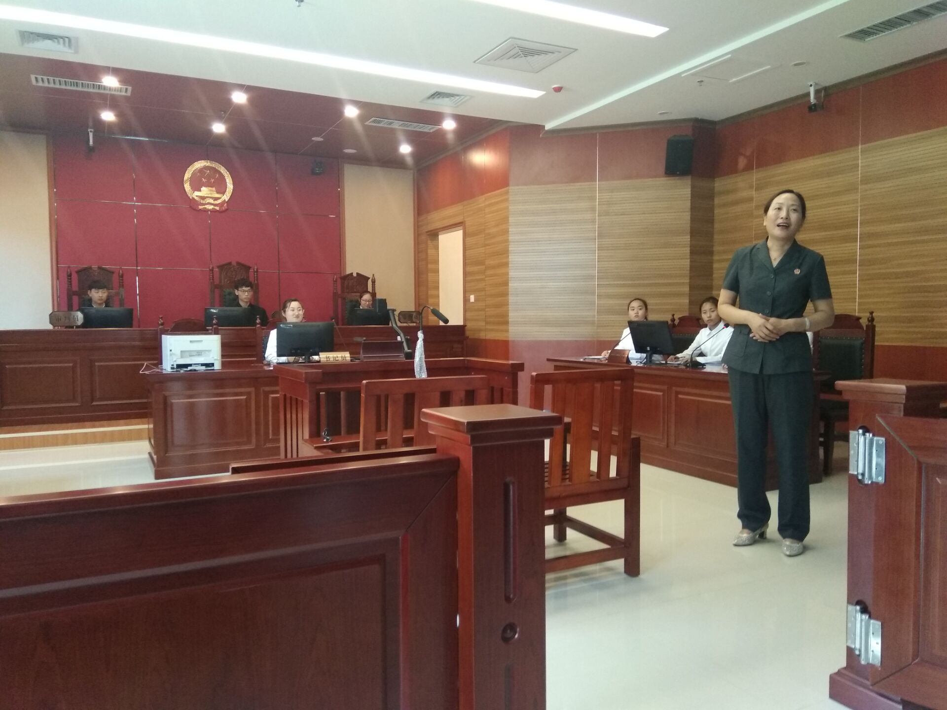 庭审中,书记员宣读庭审纪律,原告宣读起诉状,被告宣读答辩状。在审判长主持下,法庭调查、举证、质证、法庭辩论,双方作最后陈述等程序有序进行。本次庭审是围绕“被告人林昊以勒索财物为目的,在蔡军的协助下将被害人宋扬非法关押长达5日,并对其施加暴力导致被害人身体受到严重损害,5日后被害人在趁机逃跑的过程中突发心脏病而死亡,被告人林昊随即向公安机关投案自首”等案情而展开。经过审判,被告人林昊、蔡军对案件事实供认不讳,辩护人与公诉人针对对案件焦点,展开了激烈的辩论的,维护了当事人的合法权益,审判长、审判员立场明确,对案件做出了公正的判决。严谨的法庭气氛,让在场的每一位师生都感受到法庭的庄严肃穆。