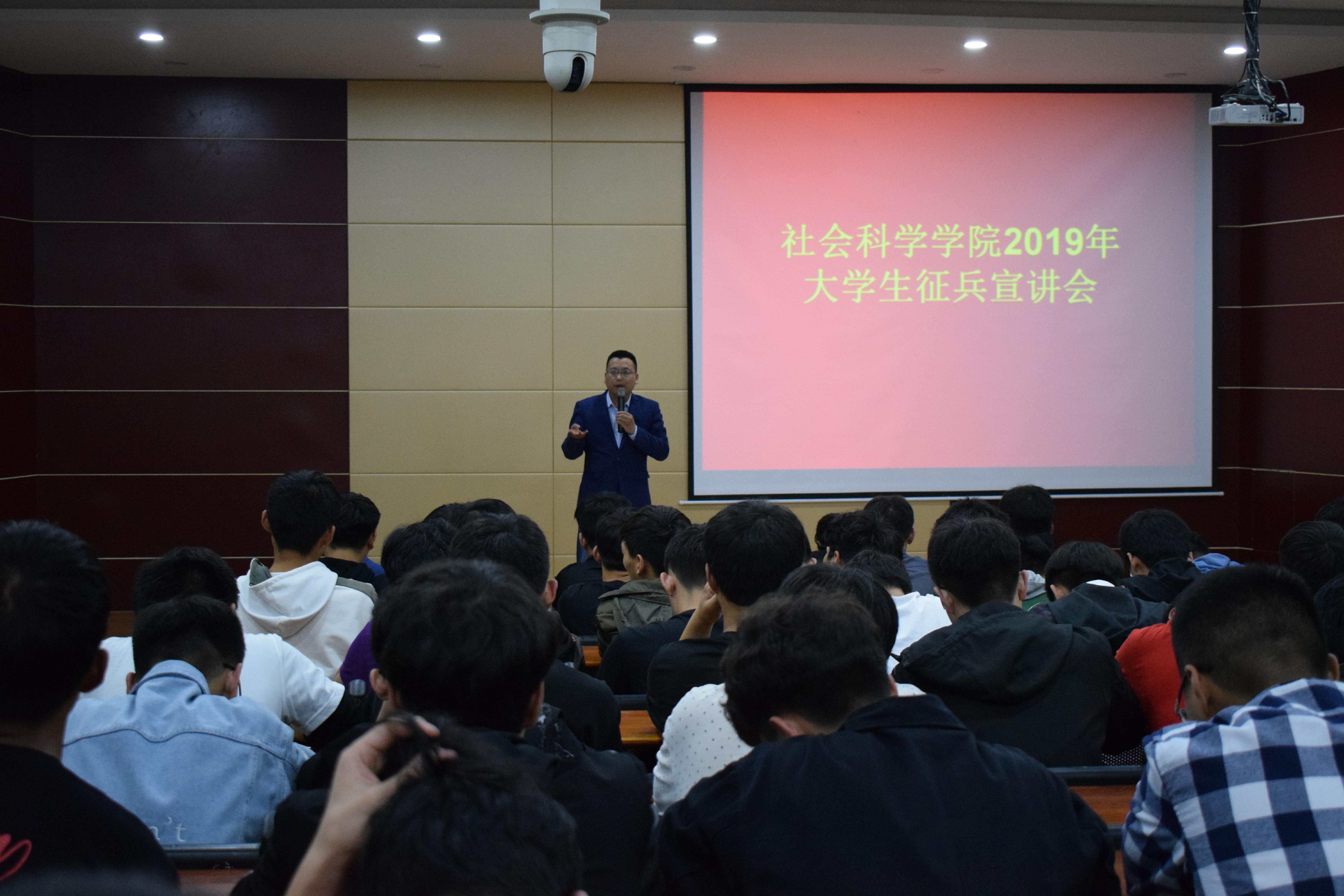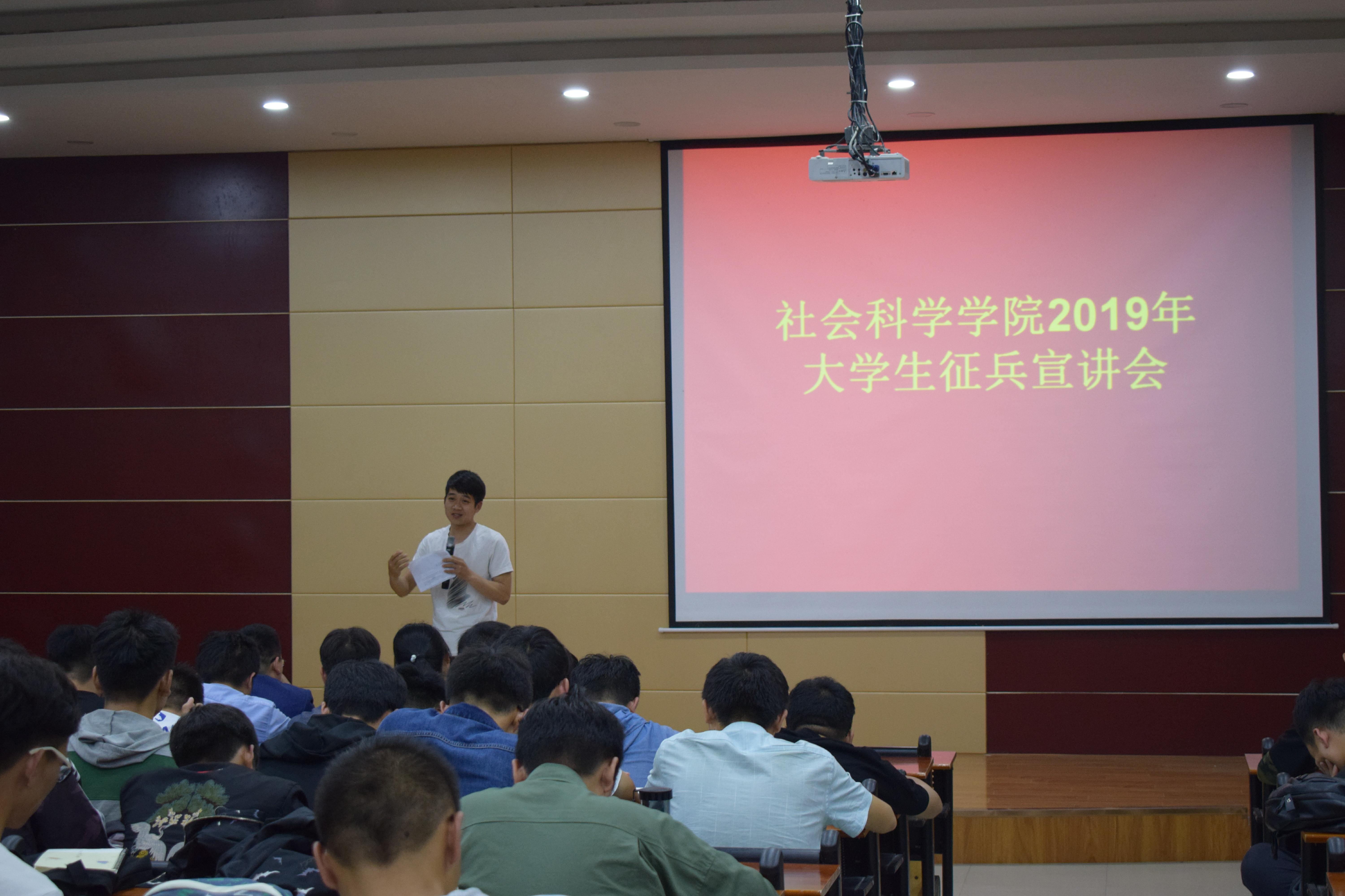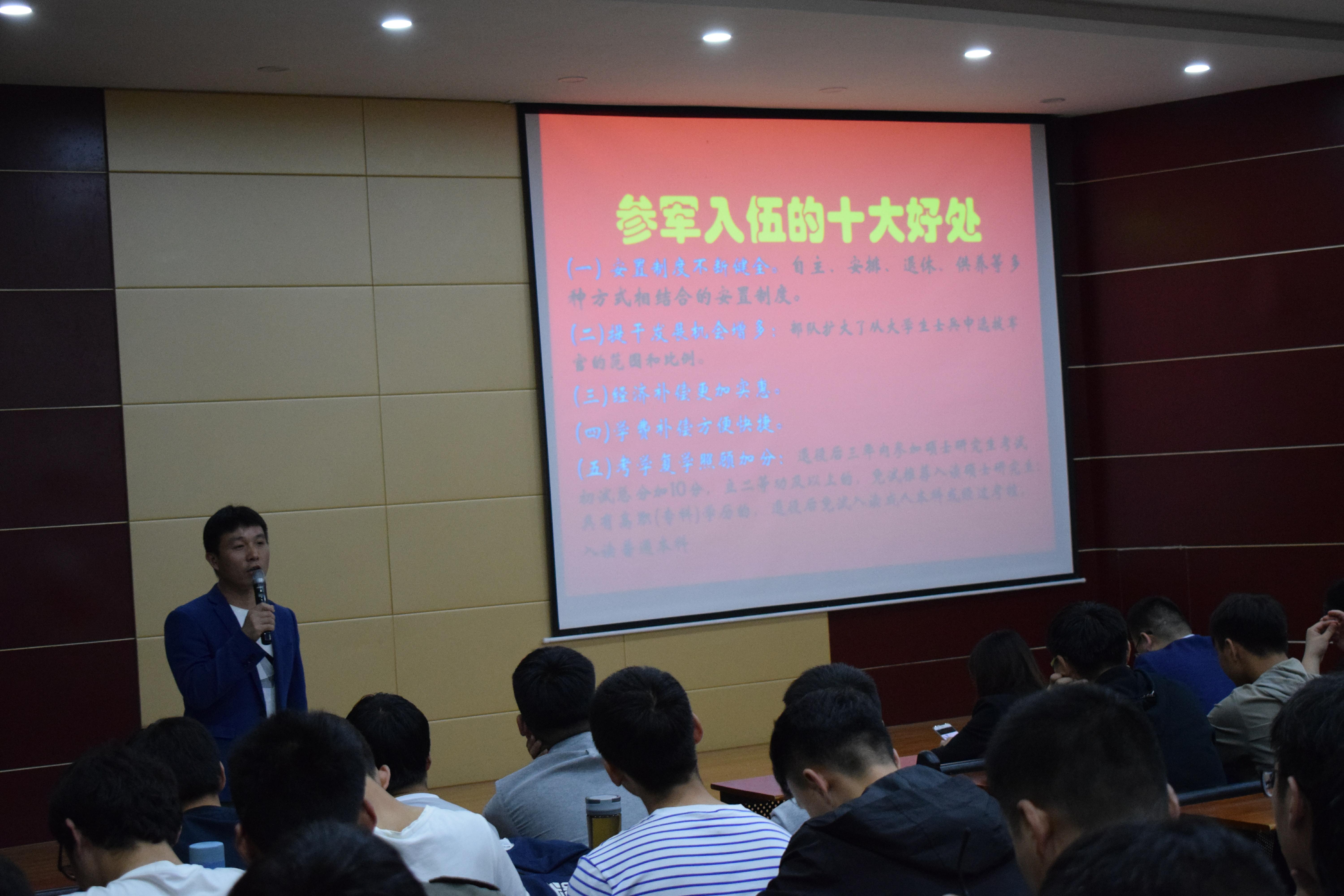 为响应国家号召,鼓励学生积极参与应征入伍,提高兵员征集质量,推进国防和军队现代化建设,太阳成集团tyc539于5月15日中午在图书馆102教室举办了2019年度大学生应征入伍宣讲动员会。本次特邀退役优秀大学生刘垚、林立青到现场宣讲。该院党总支副书记胡志国、学工干事王晶、团总支书记曹惠、辅导员刘雪、陈功林及200多名男生参加了此次活动。活动由王晶主持。