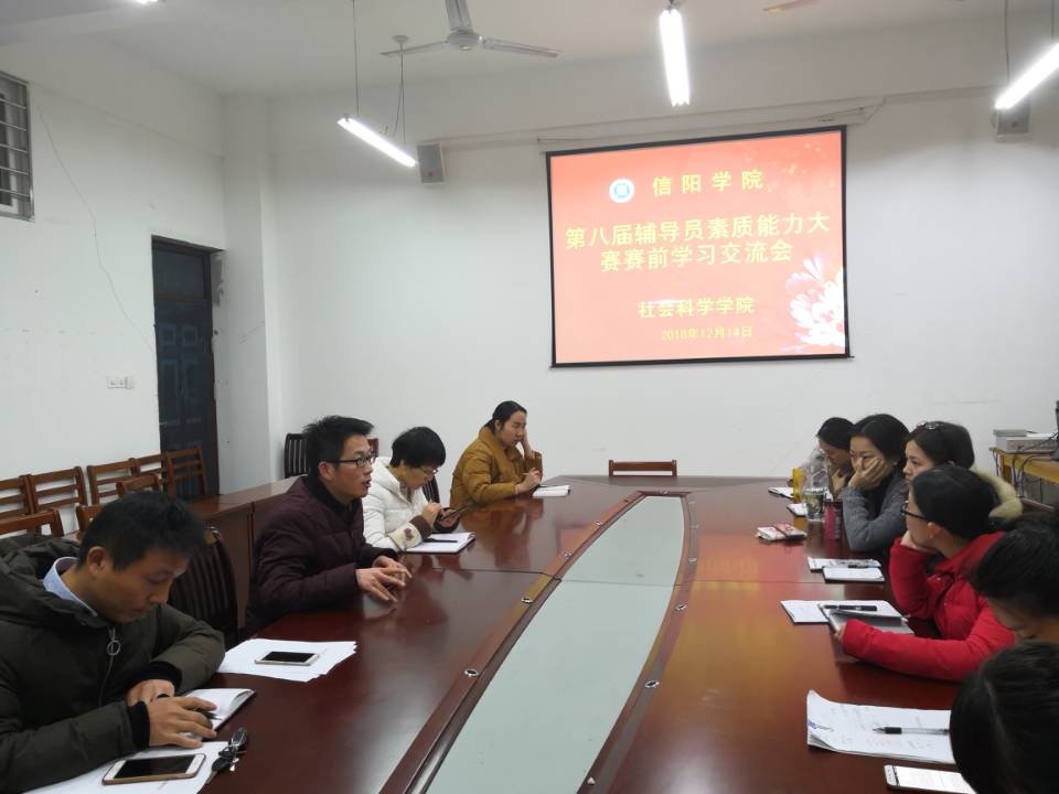 12月14日下午,太阳成集团tyc539在社科楼107会议室举办第八届辅导员素质能力大赛赛前学习交流会,该院党总支书记李赟、学工秘书刘颖方和全体辅导员参加了本次交流会。