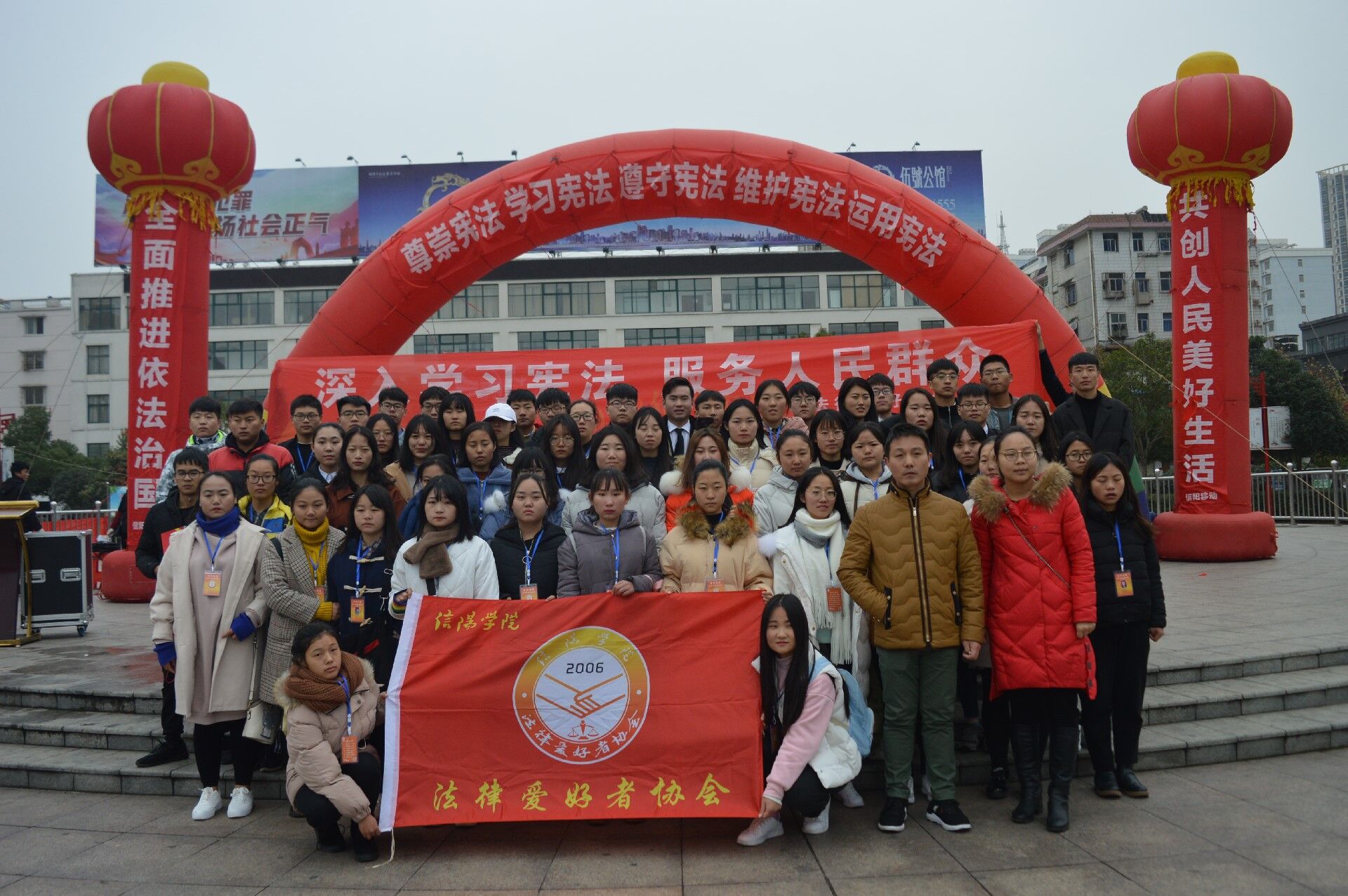 2018年12月4日是全国第五个国家宪法日。由信阳市司法局主办、太阳集团法律爱好者协会承办的“尊崇宪法 学习宪法 遵守宪法 维护宪法 应用宪法”主题宪法宣传周活动在市中心体彩广场举办。信阳市政法委书记及信阳市公检法单位主要领导出席本次活动。太阳成集团tyc539行政秘书刘颖方,法律爱好者协会指导教师胡晶,辅导员陈功林、熊天玉老师应邀参加本次活动。