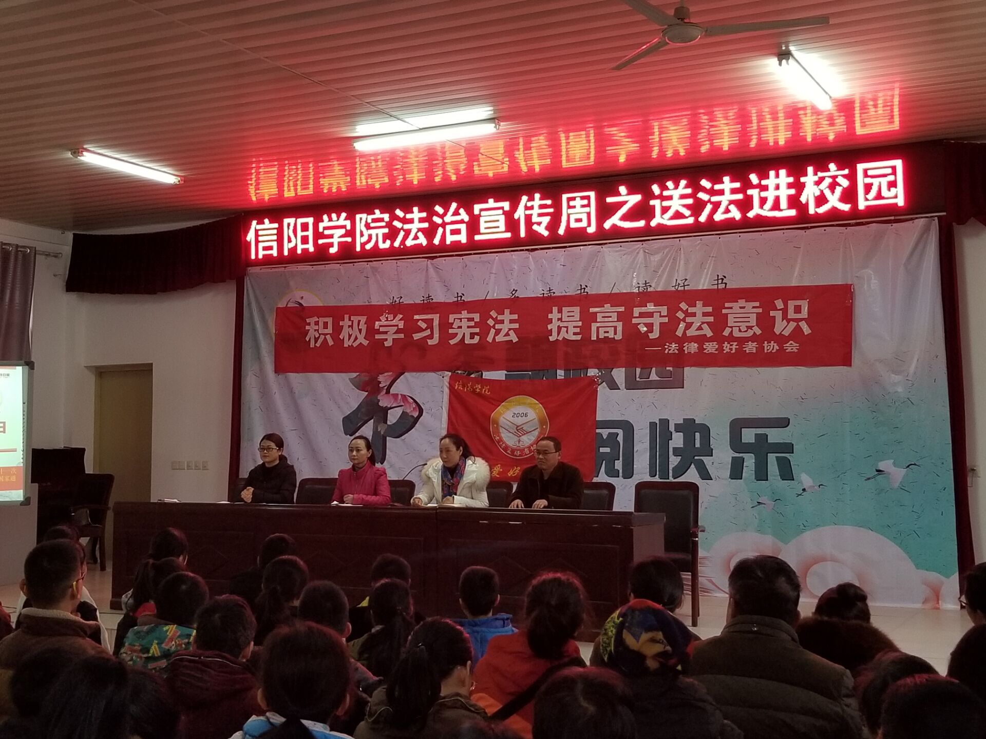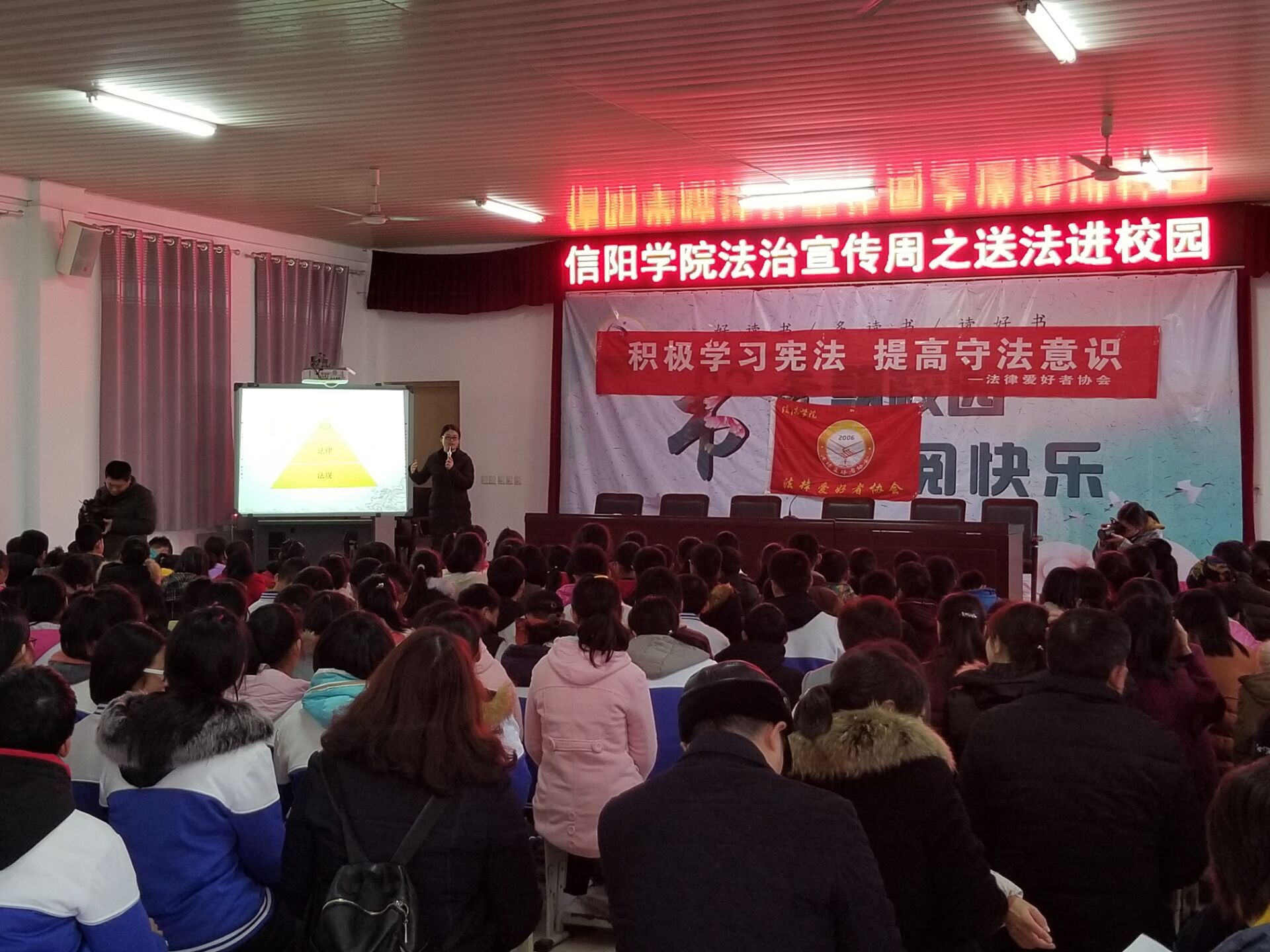 12月4日下午,太阳集团法律爱好者协会在闫春丽老师的带领下,赴信阳市二中开展“送法进校园——宪法宣讲教育”活动。本次法治教育主要围绕依法治国为主题,具体讲授了法的渊源、本质以及依法治国的重要意义。使学生初步了解个人成长和参与社会生活必备的基本法律常识,进一步强化守法意识、公民意识、权利与义务相统一观念,初步建立宪法至上、民主法治等理念,具备依法维护自身合法权益、参与社会生活的能力。