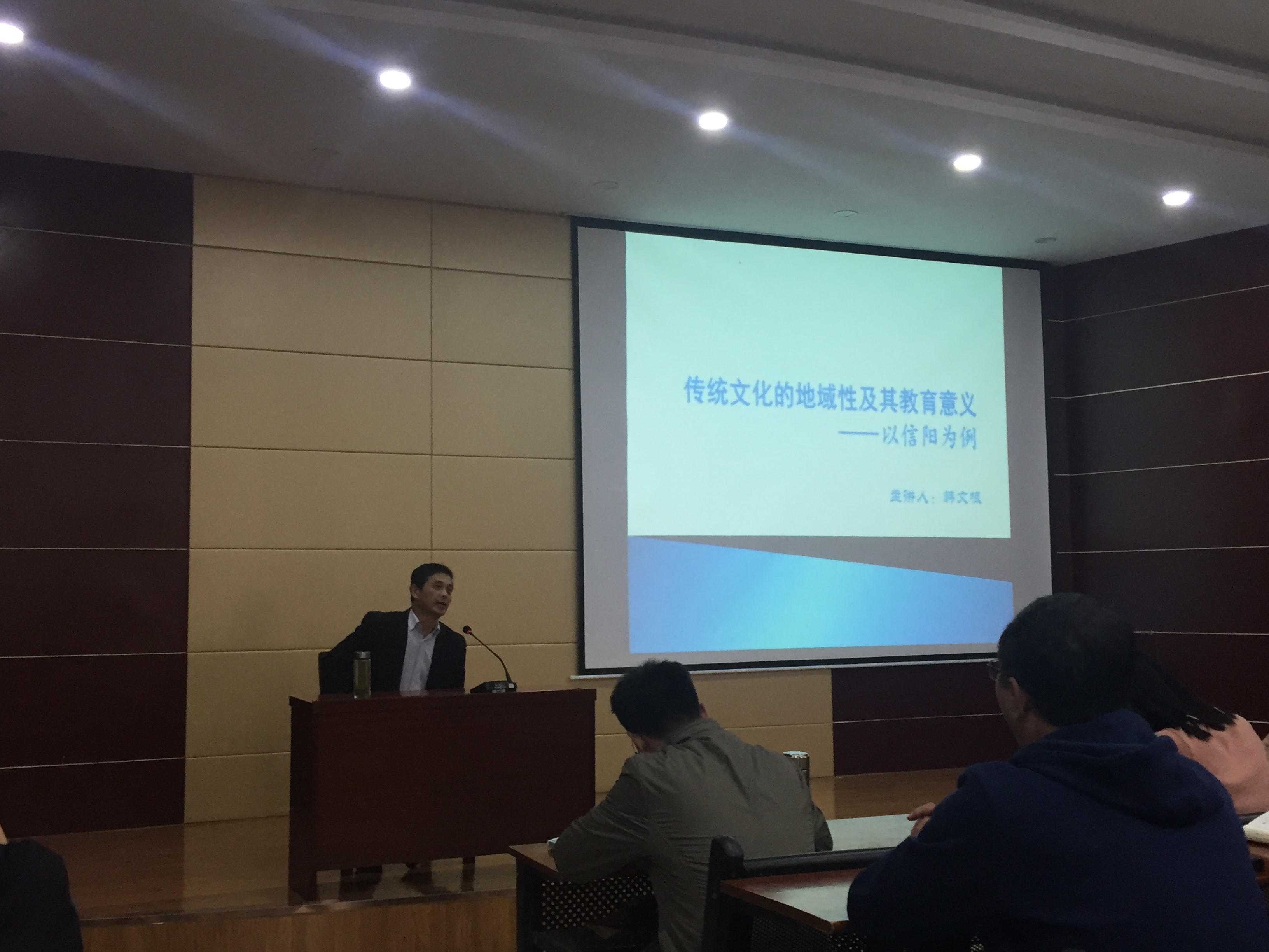 讲座过程中,韩教授对中国传统文化的基本特征进行了分析,并针对信阳的传统文化——茶文化、红色文化进行了阐释。在此基础上,着重对豫风楚韵造就的信阳历史文化名人司马光、何景明、许世友等人的精神进行阐述,并对信阳传统地域文化的教育意义进行了总结。此次讲座内容丰富多彩,语言生动富含哲理,在场的师生都获益良多,整个讲座在热烈的掌声中结束。