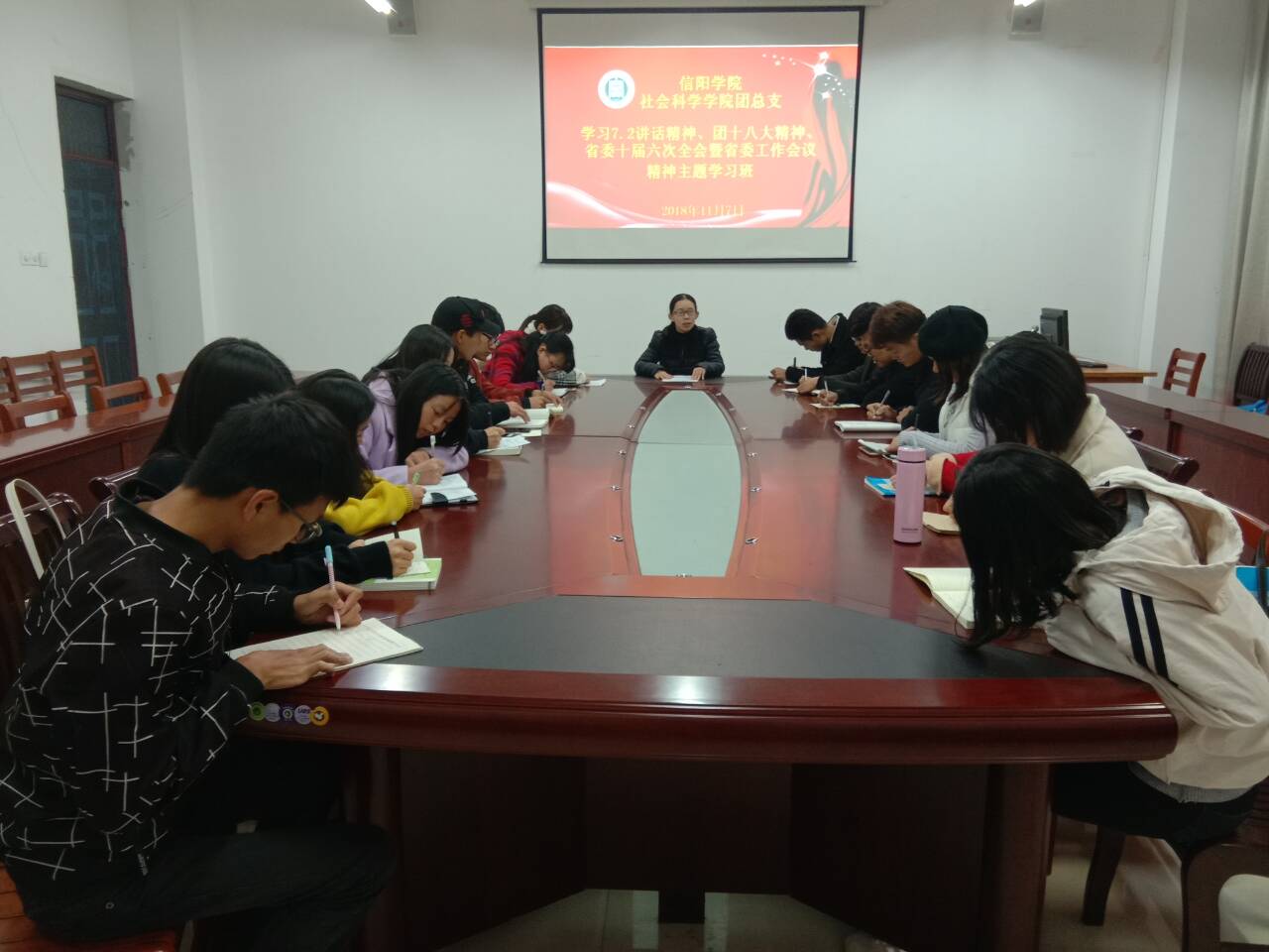 11月7日,太阳成集团tyc539团总支在社科楼107会议室举办学习7.2讲话精神、团十八大精神、省委十届六次全会暨省委工作会议精神专题学习班。太阳成集团tyc539团总支书记徐晓琰及学生干部代表参加了此次会议。