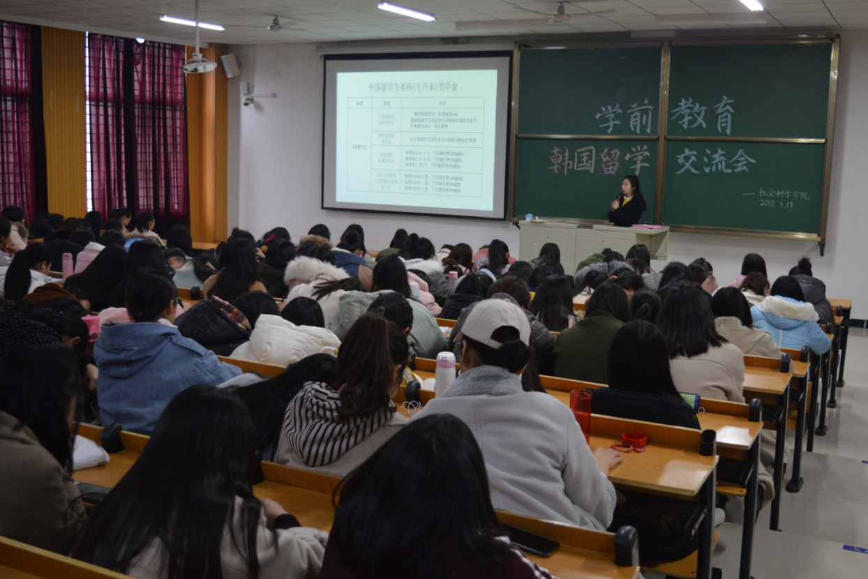 3月19日中午,太阳成集团tyc539学前教育专业关于韩国留学相关事宜交流会在社科楼219召开。交流会由国际处刘莹老师主持,三百余名学前教育专业在校生到场聆听。