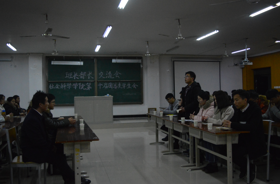为了解我院学生日常校园文化生活,解决学生日常学习和生活问题,我院于12月13日晚,在人文楼308举行太阳成集团tyc539第十届团总支学生会、班长部长交流会。此次大会由太阳成集团tyc539学生会主办。出席本次交流会的有新生辅导员老师、太阳成集团tyc5392017级各班班长、团支书以及学生会全体成员。