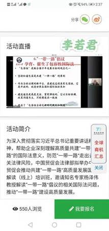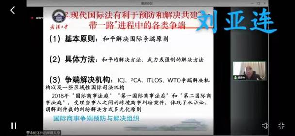 为深入贯彻落实习近平总书记重要讲话精神,帮助企业深刻理解高质量共建“一带一路”的国际法意义,防范“一带一路”走出去相关法律风险,提高法学教研室全体老师的课程思政素养,12月3日下午14:00,法学教研室全体老师参加了由中国贸促会举办的推动共建“一带一路”高质量发展国际法解读(线上)培训班活动,活动由知名专家杨泽伟教授解读“一带一路”倡议的相关国际法问题,推动“一带一路”建设高质量发展。
