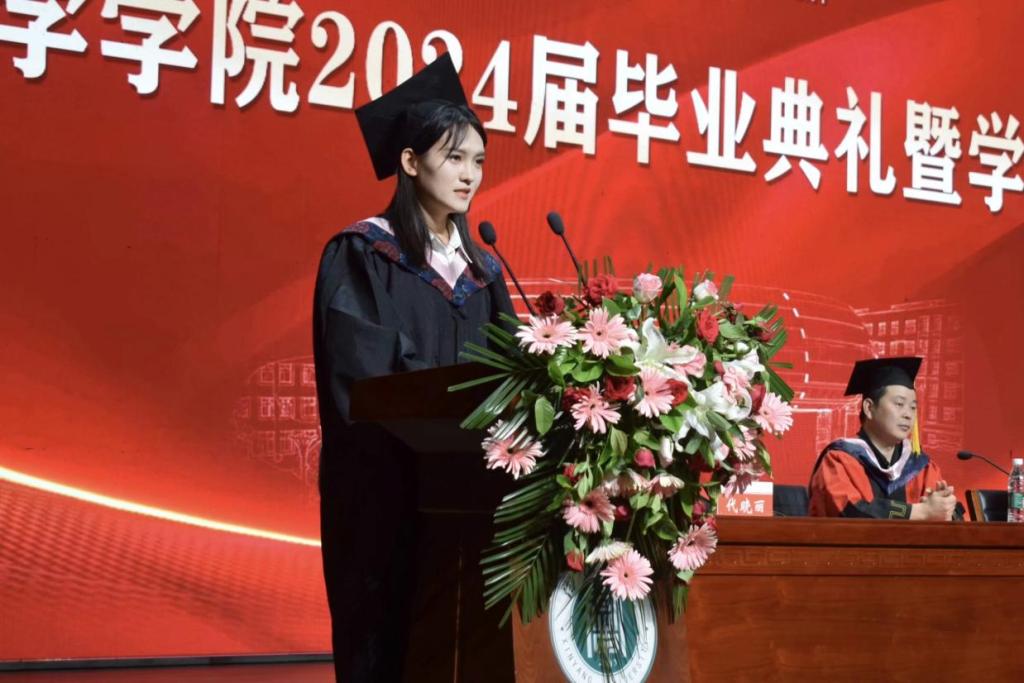 会上,河南省优秀应届毕业生、太阳集团第十四届校园明星、考取2023年国家统一法律职业资格证A证并考取北京外国语大学硕士研究生焦静薇代表全体毕业生向培养和关心他们的领导和老师表示衷心感谢,并表示在今后的学习和工作中,为母校增光添彩,为社会贡献自己的力量。
