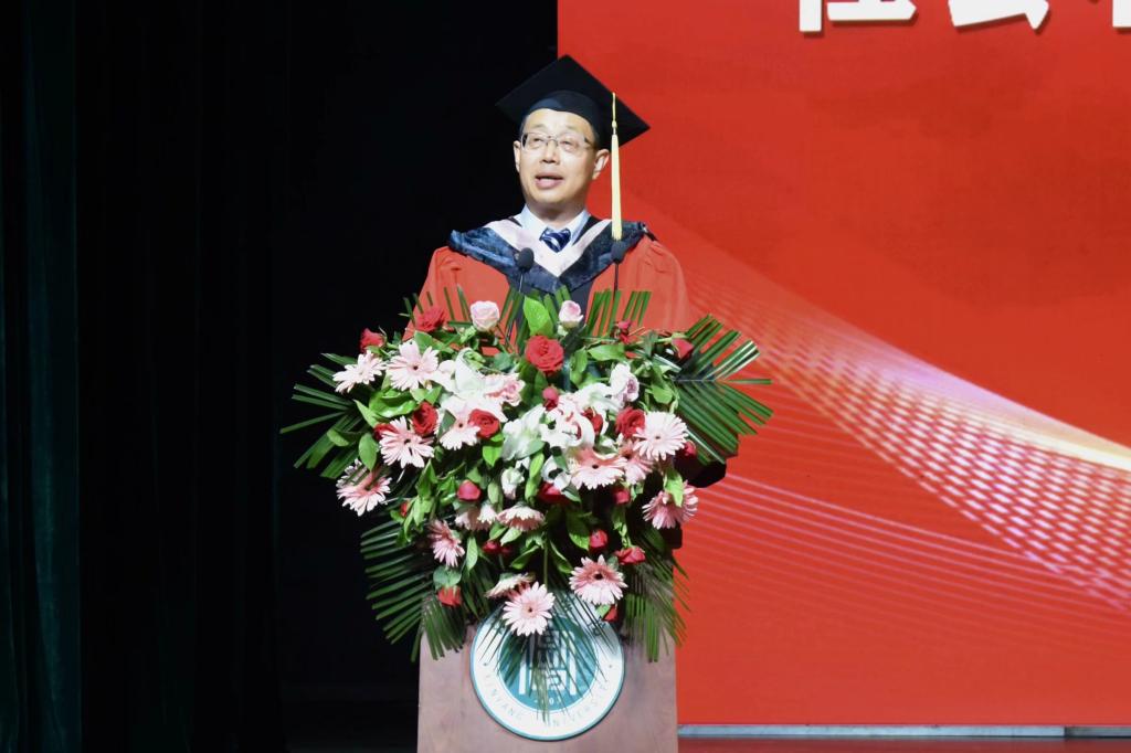 名誉院长发表毕业致辞,首先他向全体毕业生表示诚挚地祝福。他对全体毕业生顺利完成学业表示热烈的祝贺,并代表学院对全体毕业生提出三点希望:一是立“鸿鹄志”,以忠诚之我”肩负强国之使命。作为新时代的中国青年,应赓续民族精神,心怀“国之大者”,将个人成长与国家发展、个人信仰与国家富强、个人前途与国家命运紧密结合,立好“为民分忧、为民奉献、为国尽责”之长志,厚植家国情怀。二是当“实干家”,以“进取之我”担民族复兴之任。星光不问赶路人,时光不负实干者。希望同学们在踏上工作岗位后,也能脚踏实地、埋头实干,不驰于空想,不骛于虚声,在实干中淬炼过硬本领、在实战中磨砺坚强心志,在属于自己的岗位上经风雨、见世面、壮筋骨、长才干。三是燃“赤子心”,以“奋斗之我”圆人生幸福之梦。希望同学们无论从事什么工作,都能牢牢把握创新的逻辑起点,保持潜心钻研的态度,深挖根本、交叉融通,化被动为主动,打造自己的核心竞争力,成就精彩人生。