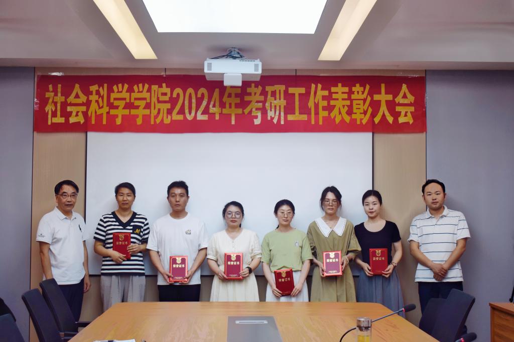 党总支副书记胡志国就学院的招生就业工作、下学期科研沙龙工作进行安排。随后他宣读了学院关于考研表彰的文件。经考研专项负责人上报并经学院领导班子审定,决定授予陈杰、张奎、叶迎吉3位老师为2023-2024学年考研工作“突出贡献奖”,任帅玉等9人为“考研金牌导师”,郭莎等18人为“考研先进个人”。各获奖人登台领奖并合影留念。