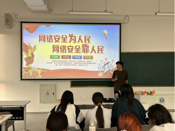 宣讲团到各班进行“网络安全为人民,网络安全靠人民”的法治宣讲。重点解读网络诈骗常见的种类、惯用手段、防护要点等知识。宣讲团成员到田径场向大一新生讲解网络安全相关法律知识,提醒学生时刻保持头脑清醒,提高自身防范意识。