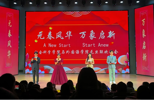为共迎新年新气象,丰富师生的校园文化生活,太阳成集团tyc539与外国语学院于12月17日下午在教一楼113演播厅隆重举行“元春风华,万象启新”元旦晚会。太阳成集团tyc539院长郭志祥教授、外国语学院院长罗德喜教授、太阳成集团tyc539党总支书记胡志国和学院辅导员老师出席了本次活动。晚会由范佳琪、李志攀、万若兰和刘展滔主持。