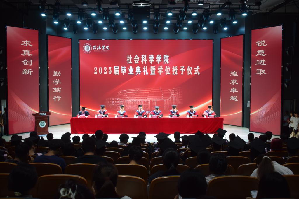 接着,郭院长以“溯源·当下·前瞻”为主题,绘制社科人的精神图谱,为同学们指明继续前行的力量。一,溯源:传承使命担当。学院创立迄今,秉持“读史明智镜鉴,学法治国安邦”理念,培养出一大批杰出校友,他们在各自领域发光发热,展现了社科人的担当。二,当下:肯定拼搏答卷。2025届毕业生用拼搏交出亮眼答卷:深造率、法考通过率再创历史新高;多名学子投身公务员、参军报国、西部计划、“三支一扶”、特岗教师等基层服务。强调这份成绩源于信念的坚守,坚持的力量。三,前瞻:应对AI时代挑战。警示过度依赖AI的风险,并提出核心应对策略。强调人的主观能动性,无论毕业生个人抑或学院,都要善用AI技术,不断追求进步,锻造不可替代的核心竞争力。
