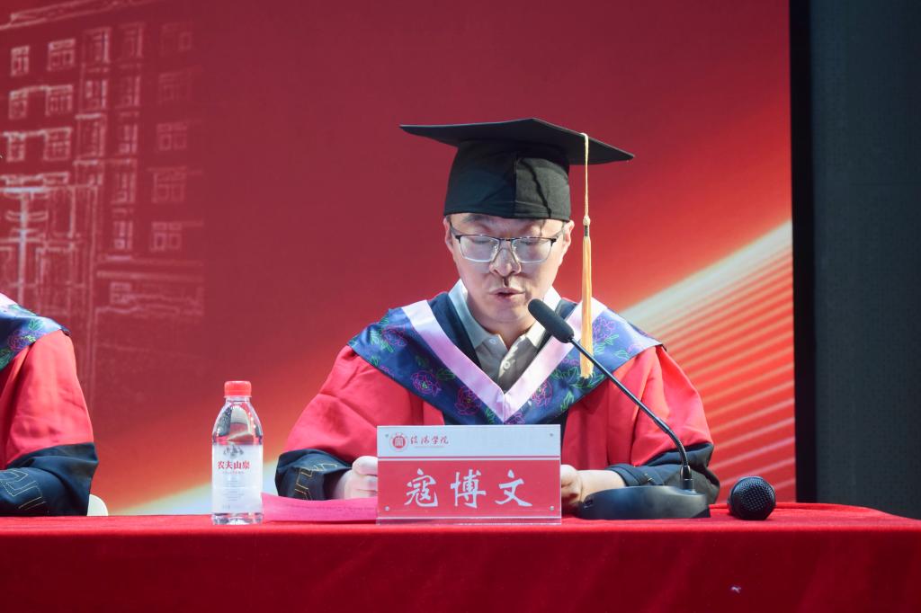 河南省优秀毕业生、河南省优秀学生干部、考取新疆出入境边防检查总站伊犁边境管理支站的2021级法学专业魏士博同学代表全体毕业生发言。他深情回顾了在学院的成长历程,对学院领导的悉心关怀和老师们的谆谆教诲表示由衷的感恩。他表示,将带着母校“求真创新,勤学笃行”的校训精神,扎根边疆、守卫国门,以实际行动践行法治理想与服务人民的初心,努力在祖国最需要的地方建功立业,不负母校培养,不负时代使命。