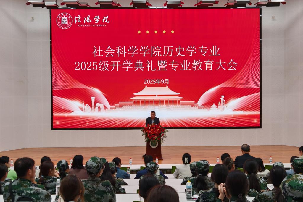教学副院长寇博文则围绕专业认知、课程体系、学业规划及学习方法等,为新生们进行了具体而实用的入学指导。法学专业汪栩正、历史学专业李思辰分别作为新生代表发言,分享了他们对所选专业的坚定热爱,表示将不负韶华、勤勉不辍,以昂扬姿态面对大学生活。党总支书记胡志国主持典礼时,从理想信念、责任担当、品格塑造三个方面对新生提出谆谆教诲。