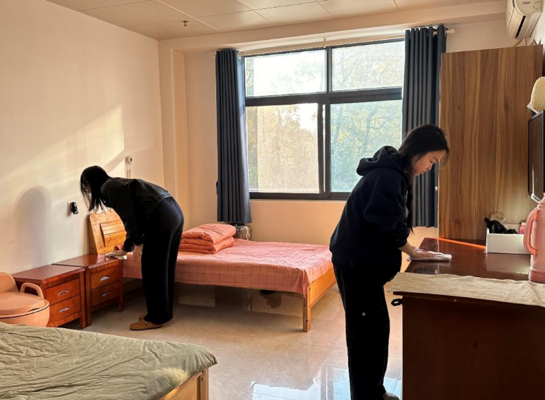 随后,学员们在护理人员指导下细致开展清洁工作,全力营造整洁舒适的居住空间。