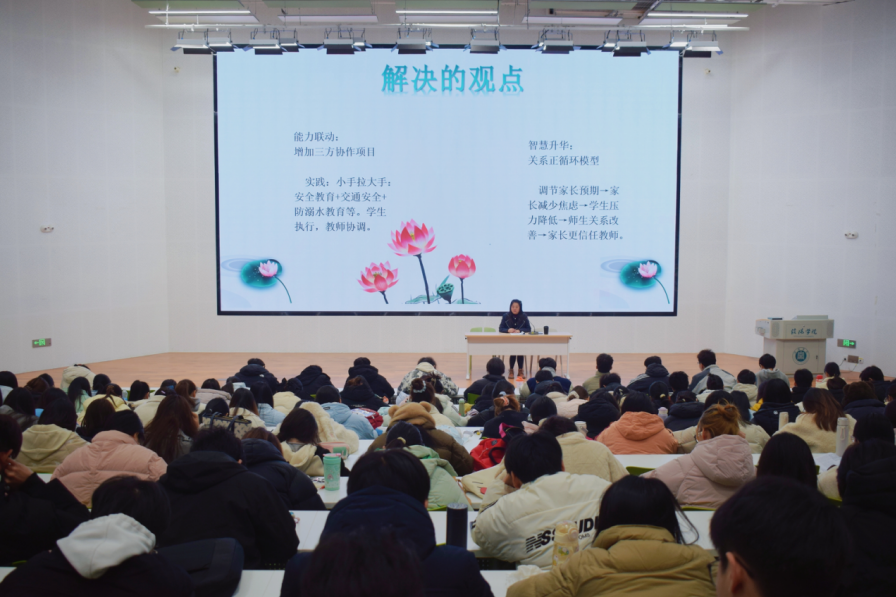 会上,许沙沙老师以《共情式沟通的实践技巧》为主题,结合自身丰富的教学与班级管理经验,倡导教师应摒弃传统的“权威型”管理模式,转向以理解、信任为基础的“赋能型”教育。许老师提出,共情式沟通是教育中最温柔的“权威”。在班级管理中,她强调要以构建教师、家长、学生的黄金三角关系为框架,善用“三明治”反馈法,注重“关系正循环”的构建,在与家长沟通时注重结构化的表达方式——先肯定学生近期亮点,再提出待改进方向,最后给出家校协作建议与下一步计划,从而实现积极、建设性的对话。