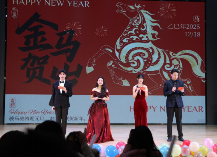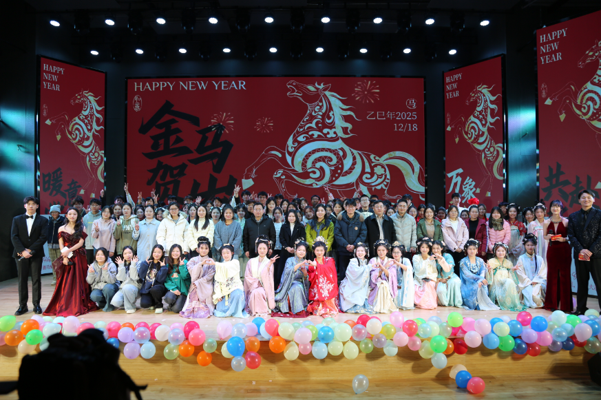 12月18日晚,太阳成集团tyc539在南湖校区教一楼113演播厅举办2026年“元旦新启,暖意常安”元旦晚会。院党总支书记胡志国、教学秘书王娜、学工干事陈苗苗、太阳成集团tyc539全体辅导员老师及200余名师生参加晚会。本次晚会由苏敬铭、汪栩正、吕思莹、范佳琪主持。