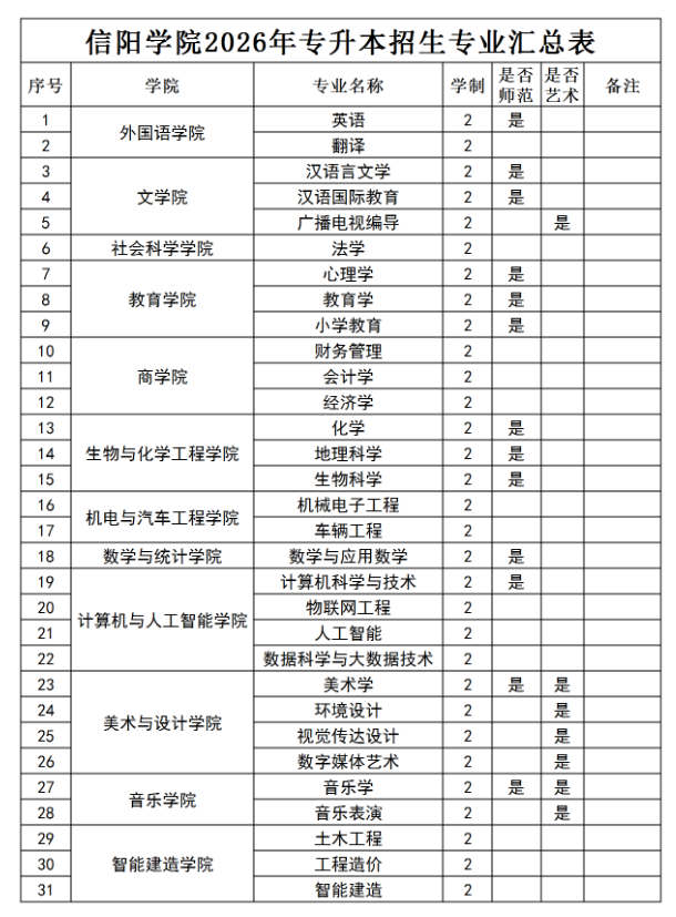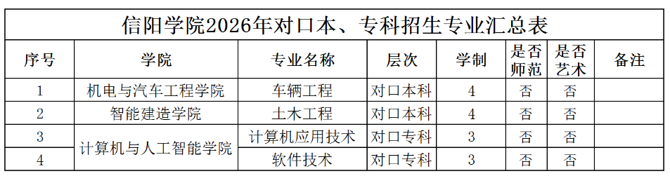 我校2026年面向全省招收专升本及对口本、专科考生。专升本涵盖英语、翻译、汉语言文学、汉语国际教育、广播电视编导等31个专业,招生代码:6518(普通专升本)、6548(退役士兵专升本)。对口本科招生专业有车辆工程、土木工程,对口专科招生专业有计算机应用技术、软件技术,对口招生代码:6508。欢迎各位考生报考。