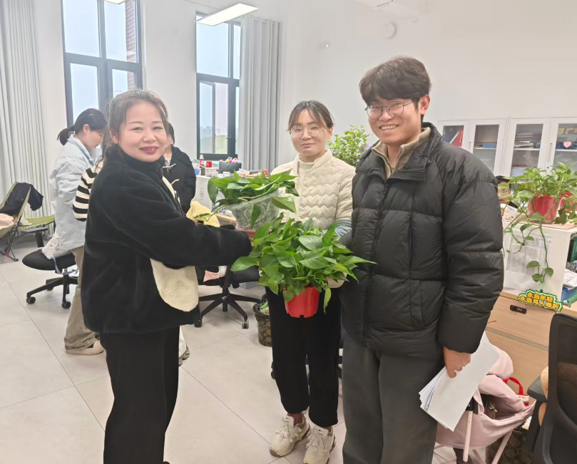 送绿植过程中,胡志国、陈苗苗与教职工们亲切交流,详细询问大家的工作状态与需求,并讲解绿植养护技巧。胡志国强调,办公环境是教职工日常工作的重要载体,添一份绿色,不仅能美化空间、净化空气,更能为忙碌的工作增一份生机与活力。他代表学院向辛勤耕耘教育教学的教职工们致以诚挚敬意,希望这一抹绿色能舒缓大家的工作压力,让大家在清新雅致的环境中保持良好状态。