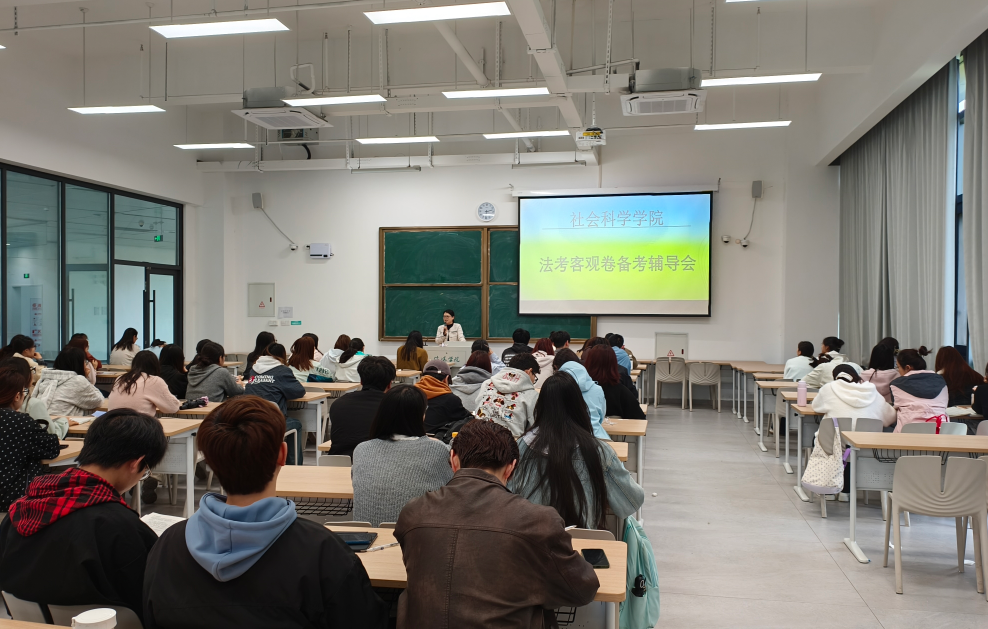 4月14日下午,太阳成集团tyc539在南湖校区教二楼102教室举办法考客观卷备考专题辅导会。闫春丽、韩宜蓉、施蕊、王浩晨、张可、郝艳等老师与2027届法学专业学生参会,学院特邀双考通过的俞雅心、胡锦秀两位同学到场分享备考经验。