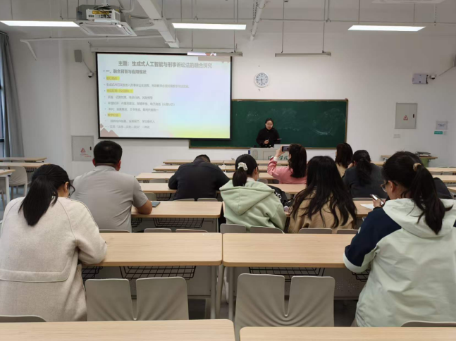 活动中,胡晶老师围绕“智能AI融合刑事诉讼法教学”为主题进行三个维度的分享。第一,根据前期调研发现,AI早已不再是抽象的司法概念,已成为公检法机关常态化的办案工具,在辅助证据梳理、智能量刑建议、电子具结书签署等方面广泛应用。为此,法学教学须主动对接司法实践,将AI应用场景纳入课堂使其直面现实问题。第二,结合教学内容深入分析AI融合刑事诉讼制度过程中呈现出的新问题,如诉讼主体地位缺位导致责任归属模糊、AI生成材料的证明力缺乏明确法律标准等。第三,针对上述困境尝试构建“法理讲授+AI实务模拟+法律批判思辨”的三维课堂,进一步优化课程内容体系,同时引导同学们重新审视技术缺陷,培育其批判性法治思维。