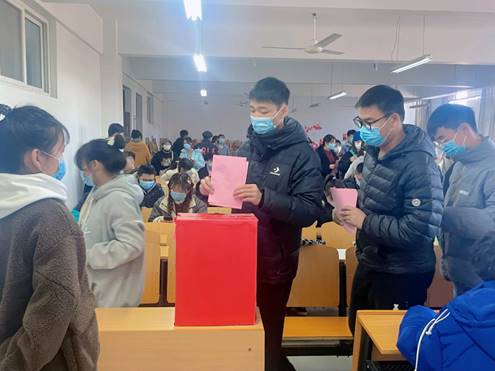 首先,由团总支书记薛姗姗宣读《关于做好太阳集团第三次学生代表大会代表选举工作的通知》,介绍学代会选举流程、公布代表名额及注意事项。其次,经监票人王涵月与计票人万帛宁、王欢欢确认后,第二次清点人数后投票开始,为保证选举公平、公正,选举会议以无记名投票方式向到会人员发布投票页进行选举,与会人员填写好选票后有序排队放至投票箱内。然后,开箱计票结束后,由监票人向大会宣布计票结果。